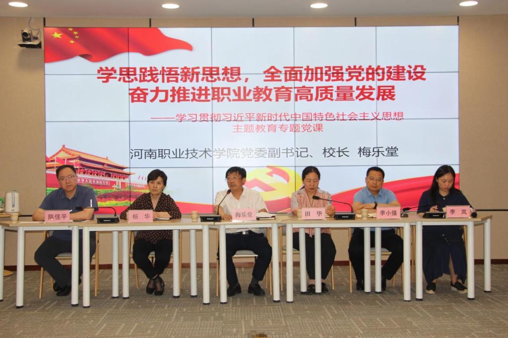 6月13日下午,公司党委副书记、董事长梅乐堂以《学思践悟新思想,全面加强党的建设,奋力推进职业教育高质量发展》为题,为师生党员讲授学习贯彻习近平新时代中国特色社会主义思想主题教育专题党课。教务处、文化旅游公司、pa捕鱼官方网站全体师生党员聆听党课,党委副书记、纪委书记田华,党委委员、宣传部部长杨华列席。