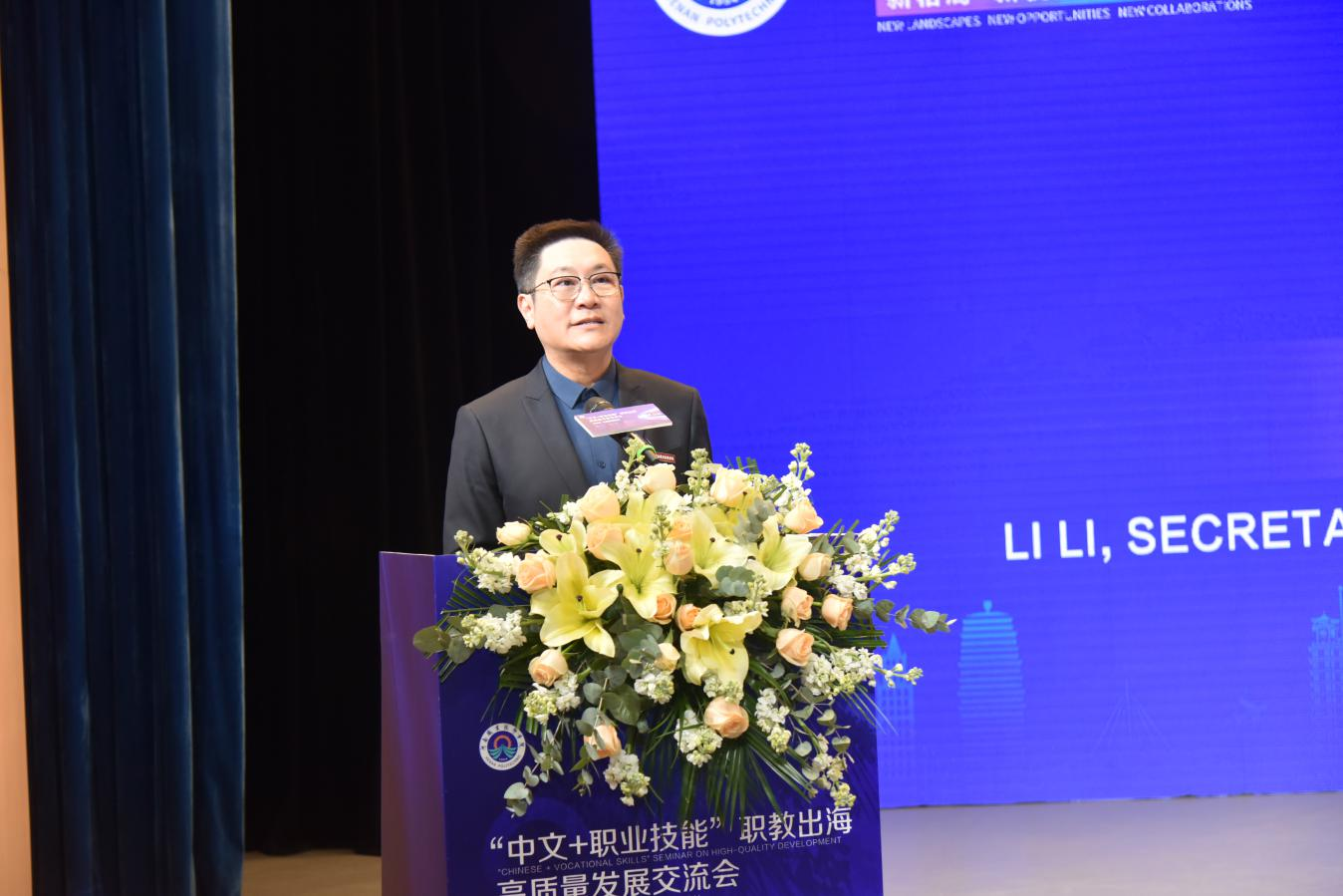 公司党委书记厉励在致辞中对与会嘉宾领导和各界朋友来校表示热烈的欢迎和诚挚的感谢,并简要介绍了公司办学历程、办学特色和办学成绩,重点分享了公司在国际合作交流和“中文+职业技能”职教出海中取得的显著成效。他期待,能够携手海内外职业院校,扎根中国、融通世界,立足时代、面向未来,不断加大与“一带一路”沿线国家的合作与交流,建立健全职业教育国际化人才培养体制机制,打造具有全球胜任力的人才培养体系,为构建人类命运共同体贡献职业教育力量。