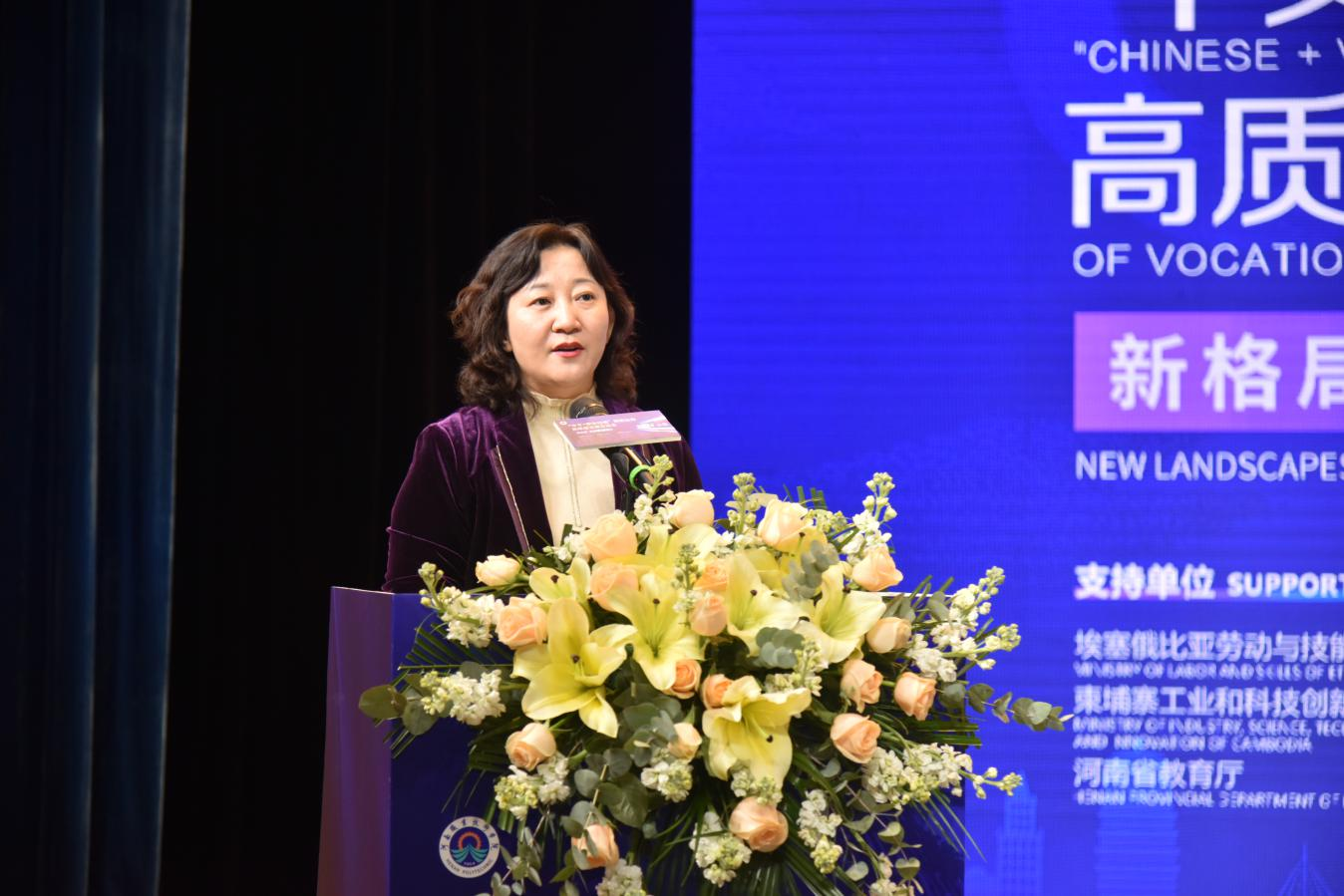 河南省教育厅对外合作交流处处长王华星在致辞中对会议的召开表示了祝贺。她指出,河南省委、省政府高度重视教育对外开放,与世界120余个国家和地区开展了教育合作与交流,为“一带一路”沿线国家培养了大批本土化实用技能人才,河南教育国际影响力日益增强。她表示,在共建“一带一路”倡议奔向下一个金色十年的开局之年,河南省教育厅推出了特色职教品牌“大河工坊”,期待以“中文+职业技能”为主要内容,分享中国专业标准、课程标准、教学资源,搭建民心相通、文明互鉴的桥梁,共商、共建、共享职业教育发展最新成果。