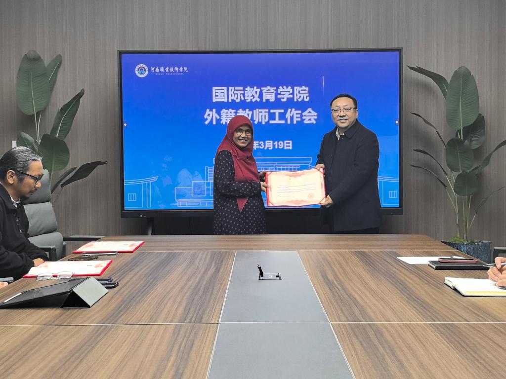鲁冬首先对全体外教表示感谢,对本学期马来西亚国民大学外教团队表示欢迎。他指出,外教为公司国际化办学能力和人才培养质量的提升做出了巨大贡献,是公司不可或缺的国际化力量,希望外教能够充分发挥自己的专长和优势,与公司的教学团队紧密合作,共同探索符合公司实际的中外合作办学模式。随后,鲁冬向马来西亚国民大学教师颁发聘书。