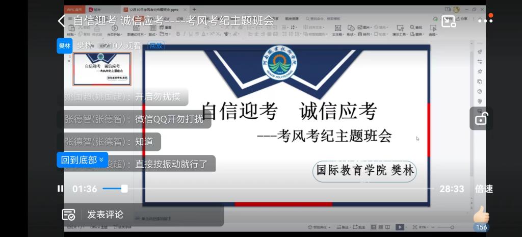 此次主题班会的召开,旨在营造公平、公正、健康的考试环境,严肃公司考风考纪,使员工进一步端正学习态度,明确学习目的,严守考试纪律,共建良好考试环境。同学们记录、聆听、分享自己对诚信的理解,纷纷表示,会在考试中奉守诚实原则,自觉约束、规范自己的言行,严格遵守考试纪律。(撰稿:曹芃芑;审稿:于瑾)