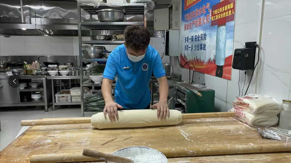 活动现场,非遗传承人首先进行了技艺展示。在制作过程中,师傅运用特制工具,通过“八擀八推八压”的传统工序,将面团擀制成薄可透光的面皮。随后使用三尺长的大刀进行切制,刀起面落间,细如发丝的面条整齐呈现,令在场师生赞叹不已。在实践体验环节,师生参与了揉面、擀制、切面等工艺流程。通过亲手操作,大家深刻体会到,看似简单的制作过程,实则蕴含着丰富的技艺要领。每一道工序都需要长期练习才能掌握,充分展现了传统手工的专业性和技艺性。