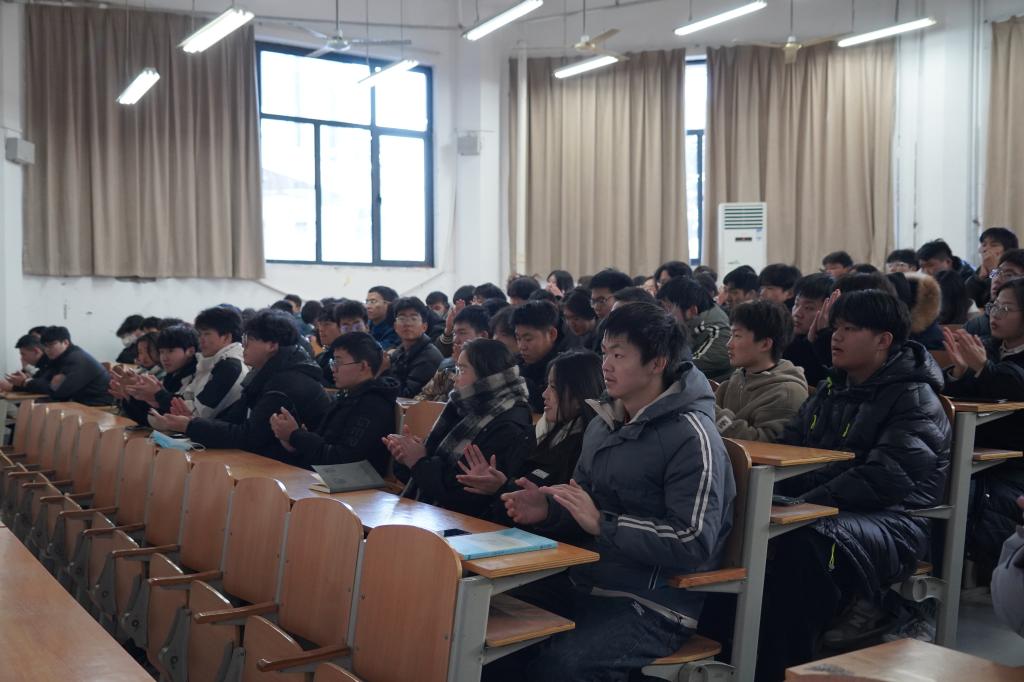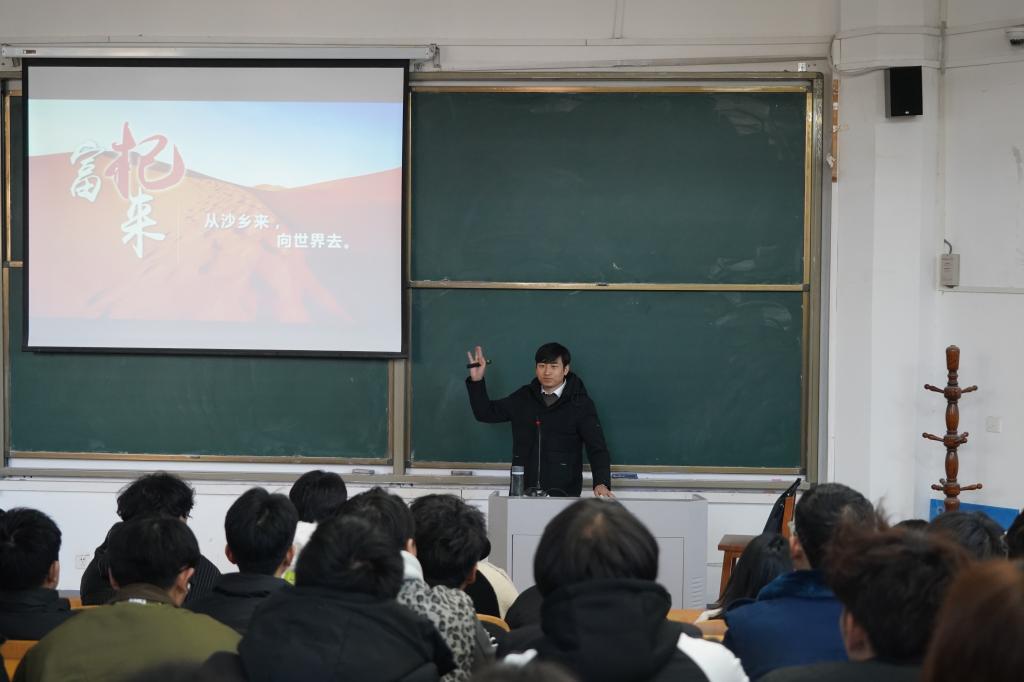 黄俊科首先分享了自己的成长经历和创业故事。他以一个接地气的问题:“你们有没有见过沙漠?”开始,介绍了自己的家乡甘肃省民勤县,以“黄、晃、慌”概括出了当时家乡的困境,讲述了自己上了大学开眼看世界之后,想用知识和科技改变家乡贫穷面貌的创业初心,在道阻且长的创业之路上,遇到困难不放弃,多维思考找寻契机破局的艰辛历程。他心怀故乡的家国情怀和解决问题的方法思路,让同学们敬佩不已,掌声阵阵经久不息。